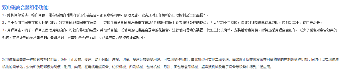 雙電磁離合器組采用DC24V電流,進口軸承、高級摩擦材質(zhì)(來令片)。兩個電磁離合器裝置于軸兩端,可裝置皮帶輪、鏈輪等元件。正反轉(zhuǎn)專用,結構非常獨特,安裝也極為簡便。緊湊的貫通軸結構,即兩個電磁離合器都裝置在同軸上,極其的合理配置產(chǎn)著各種部件;