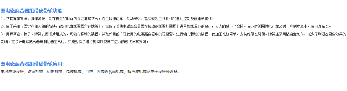 雙電磁離合器組TL-POF1型附雙皮帶輪,或稱之為雙重電磁離合器組,由兩個TL-A型摩擦式電磁離合器組成。兩個電磁離合器都是露在圓桶外面,適用在正反轉(zhuǎn)組合動力傳達分配、2段變速組合等,獨特設(shè)計的組合,摩擦部不易磨耗,動作精確、轉(zhuǎn)動部分慣性小。