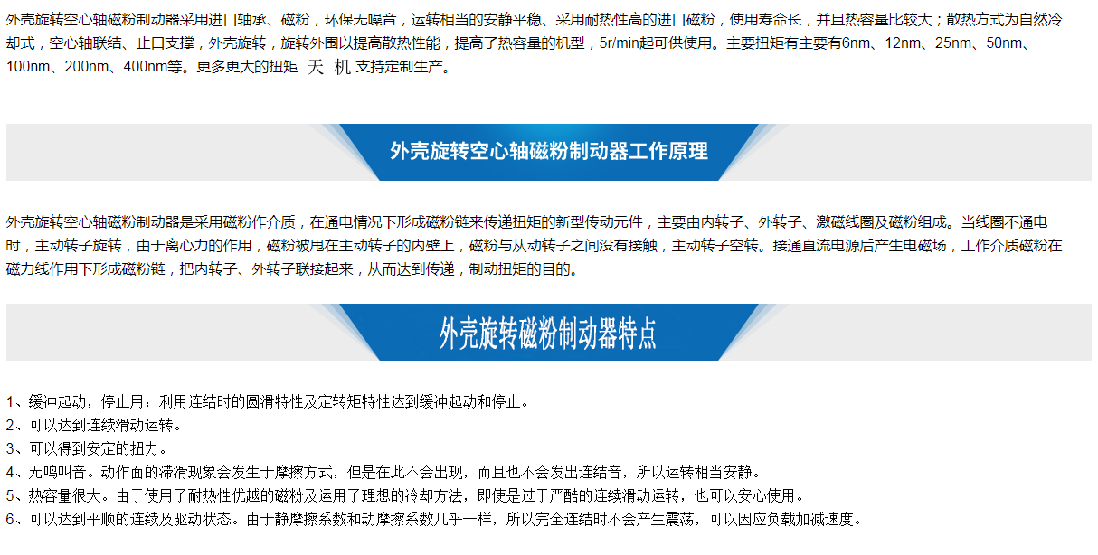 外殼旋轉空心軸磁粉制動器采用進口軸承、磁粉,環(huán)保無噪音,運轉相當?shù)陌察o平穩(wěn)、采用耐熱性高的進口磁粉,使用壽命長,并且熱容量比較大;散熱方式為自然冷卻式,空心軸聯(lián)結、止口支撐,外殼旋轉,旋轉外圍以提高散熱性能,提高了熱容量的機型,5r/min起可供使用。主要扭矩有主要有6nm、12nm、25nm、50nm、100nm、200nm、400nm等。更多更大的扭矩天機支持定制生產(chǎn)。