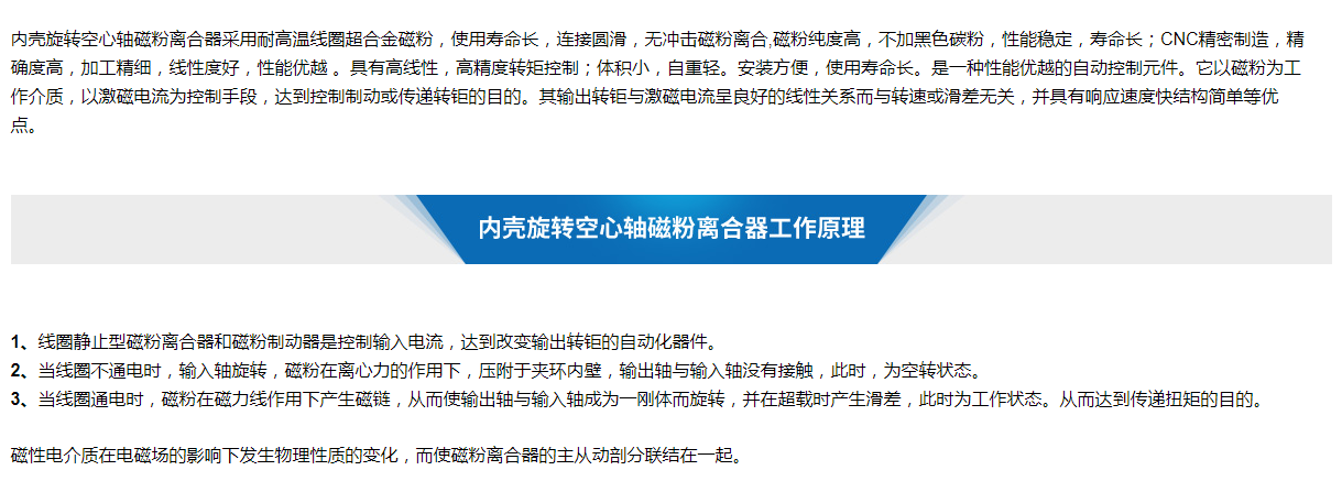 內(nèi)殼旋轉(zhuǎn)空心軸磁粉離合器采用耐高溫線圈超合金磁粉,使用壽命長(zhǎng),連接圓滑,無(wú)沖擊磁粉離合,磁粉純度高,不加黑色碳粉,性能穩(wěn)定,壽命長(zhǎng);CNC精密制造,精確度高,加工精細(xì),線性度好,性能優(yōu)越 。具有高線性,高精度轉(zhuǎn)矩控制;體積小,自重輕。安裝方便,使用壽命長(zhǎng)。是一種性能優(yōu)越的自動(dòng)控制元件。它以磁粉為工作介質(zhì),以激磁電流為控制手段,達(dá)到控制制動(dòng)或傳遞轉(zhuǎn)鉅的目的。其輸出轉(zhuǎn)鉅與激磁電流呈良好的線性關(guān)系而與轉(zhuǎn)速或滑差無(wú)關(guān),并具有響應(yīng)速度快結(jié)構(gòu)簡(jiǎn)單等優(yōu)點(diǎn)。