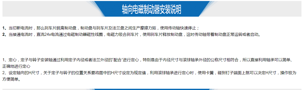 軸向電磁制動(dòng)器,它使用DC24V,由定子、板型彈片、銜鐵(電樞板)、磁性線圈、來令片、鋁導(dǎo)座等元件構(gòu)成,標(biāo)準(zhǔn)規(guī)格有0.6-40KG等等。(非標(biāo)規(guī)格可定制生產(chǎn))