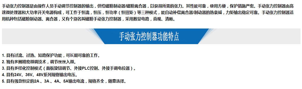 手動張力控制器是由操作人員手動調(diào)節(jié)控制器的輸出,供給磁粉制動器/磁粉離合器,以獲得所需的張力。其性能可靠,使用方便,保護(hù)措施嚴(yán)密。
